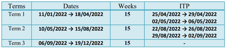 상기 FBI 캘린더를 보시면 1년에 세 번의 Term을 두고, 그 사이에 2주간 ITP가 있습니다.