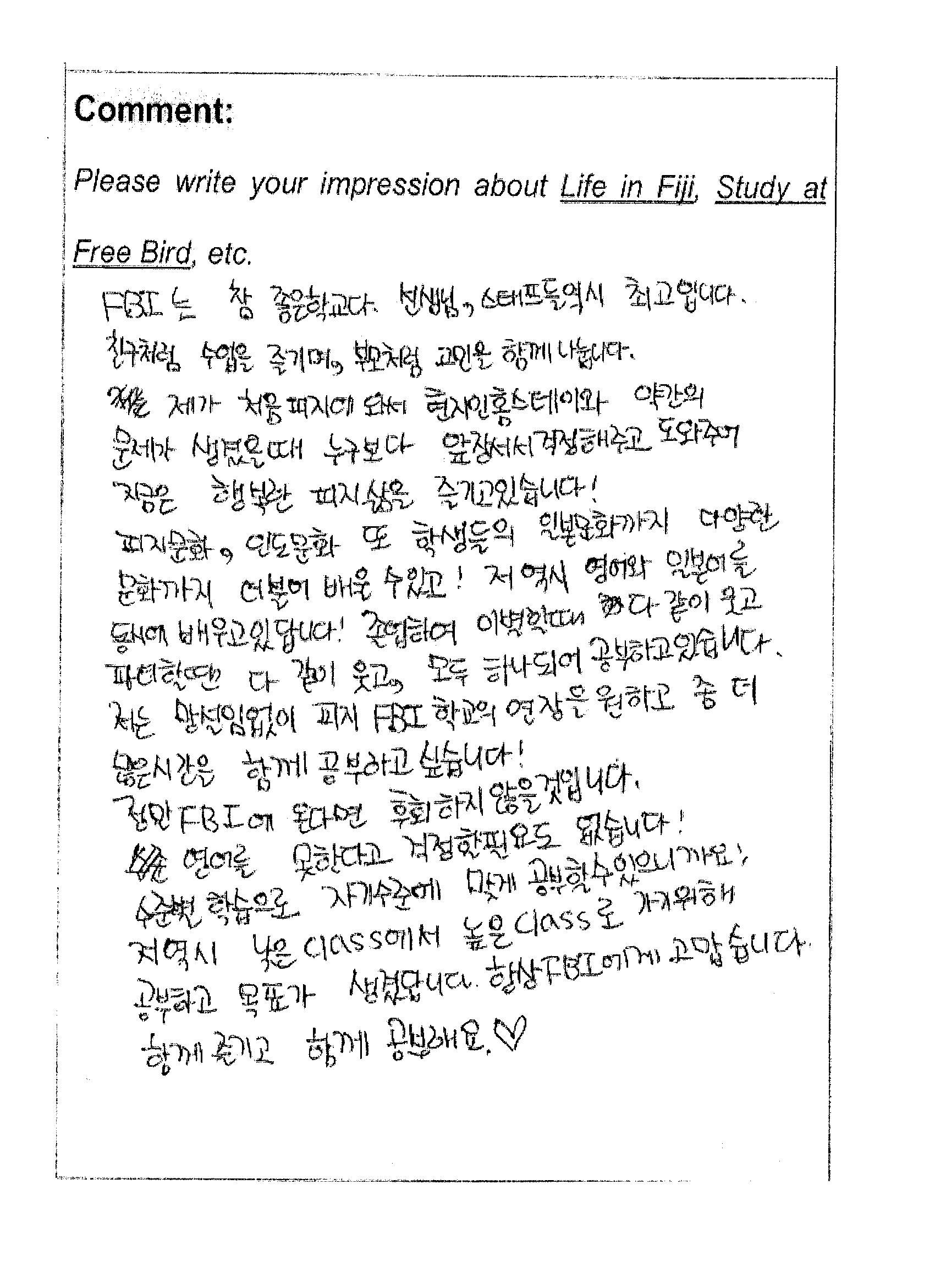 저는 망설임없이 피지 FBI학교의 연장을 원하고, 좀 더 많은 시간을 함께 공부하고 싶습니다.